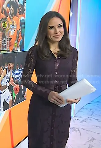 Kaylee Hartung on Today on NBC was spotted wearing this burgundy belted lace shirtdress on Today on Mar 16 2026's episode. Kaylee's Dresss is the Satin Detail Lace Midi Dress by Derek Lam 10 Crosby.