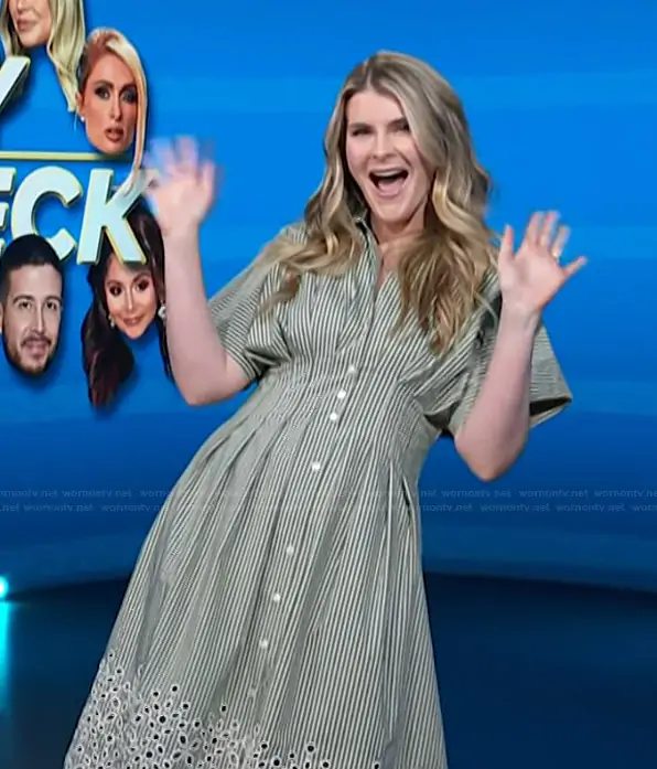 on Access Hollywood on NBC was spotted wearing this green stripe shirtdress on Access Hollywood on Mar 16 2026's episode. 's Dress is the The Tobie Eyelet Shirt Dress by Exquise by Exquise.