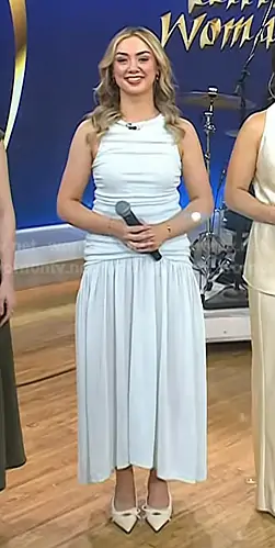 on Today on NBC was spotted wearing this light blue gathered dress on Today on Mar 16 2026's episode. 's Dress is the Evidente Dress in Stone Blue by Bite Studios . 's Shoes is the Bow Slingback Shoes in White by Zara.