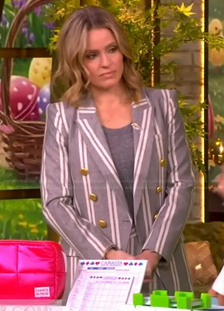 Sara Haines on The View on ABC was spotted wearing this gray stripe blazer and pants on The View on Mar 16 2026's episode. Sara's Blazer is the Kendi Long Double Breasted Blazer by L'Agence . Sara's Pants is the Allanah Stripe Mid Rise Pants by L'Agence.