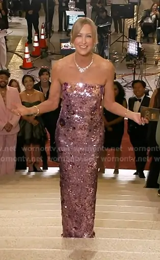 Lara Spencer on Good Morning America on ABC was spotted wearing this lilac sequin strapless gown on Good Morning America on Mar 13 2026's episode. Lara's Dress is the Dazzling Lilac Sequin Strapless Gown with Floral Accents 42154 by Jovani.