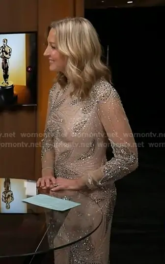 Lara Spencer on Good Morning America on ABC was spotted wearing this nude beige embellished mesh gown on Good Morning America on Mar 16 2026's episode. Lara's Dress is the Embellished Evening Gown 47094 in Nude by Jovani.
