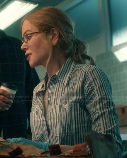 Kay Scarpetta (played by Nicole Kidman) on Scarpetta on Amazon Prime was spotted wearing this blue striped shirt on Scarpetta on episode 'Dot' (1x03) in Mar 2026. Kay's Top is the Striped Shirt Blue White Cotton Shirt by Nili Lotan.