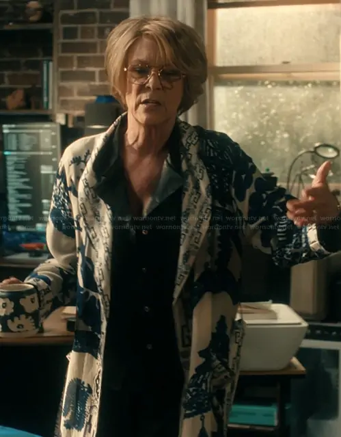 Dorothy Farinelli (played by Jamie Lee Curtis) on Scarpetta on Amazon Prime was spotted wearing this printed robe on Scarpetta on episode 'Benton' (1x06) in Mar 2026. Dorothy's Robe is the Giant Willow Woven Wrap Robe by One Hundred Stars.