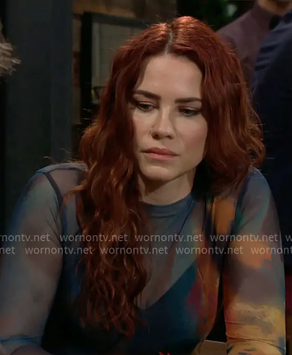 Sally Spectra (played by Courtney Hope) on The Young and the Restless on CBS was spotted wearing this teal printed mesh top on The Young and the Restless on Mar 18 2026's episode.