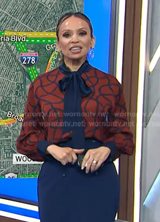 Adelle Caballero on Today on NBC was spotted wearing this red printed tie neck blouse on Today on Mar 18 2026's episode. Adelle's Top is the Lucille Rope Print Silk Tie Neck Blouse in Orange by LK Bennett.
