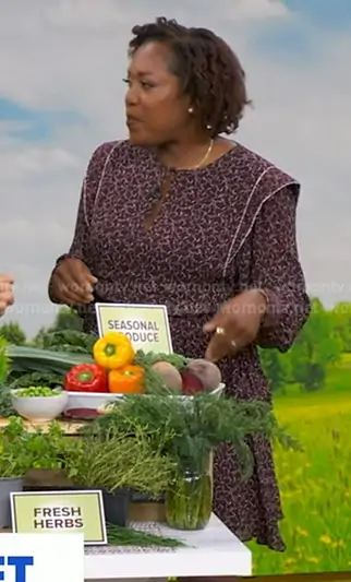 on Good Morning America on ABC was spotted wearing this burgundy print mini dress on Good Morning America on Mar 31 2026's episode. 's Dress is the Contrast-piping Mini Dress with modern print by Boss . 's Shoes is the Rachie Platform Bootie in Plum by Jessica Simpson.