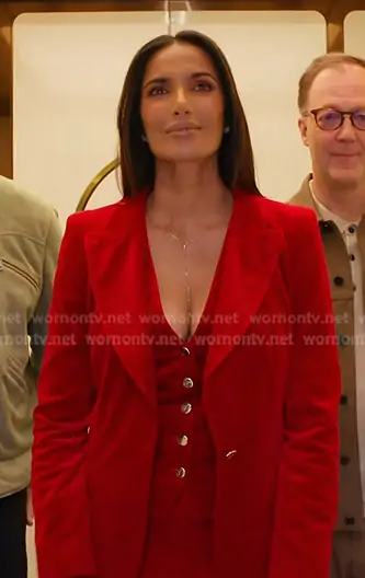 Padma Lakshmi on Americas Culinary Cup on CBS was spotted wearing this Padma’s red velvet vest, blazer and pants on Americas Culinary Cup on episode 'Nice Big Squash' (1x03) in Mar 2026. Padma's Vest is the Clove Velvet Waistcoat in Scarlet by Temperley London . Padma's Jacket is the Clove Velvet Jacket in Scarlet by Temperley London . Padma's Pants is the Clove Velvet Waisted Trousers in Scarlet by Temperley London.