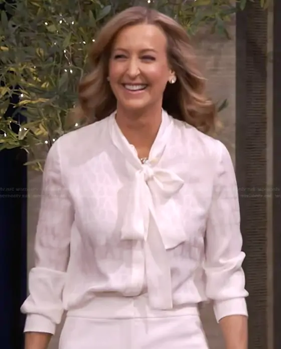 on Live with Kelly and Mark on Disney ABC Home Entertainment was spotted wearing this white silk tie neck blouse on Live with Kelly and Mark on Mar 19 2026's episode. 's Top is the Tonal V-Logo Print Scarf-Neck Silk Blouse by Valentino Garavani.