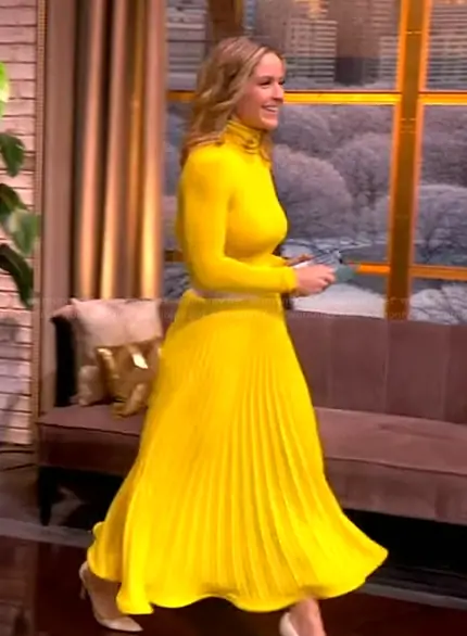 Sara Haines on The View on ABC was spotted wearing this yellow pleated skirt on The View on Mar 19 2026's episode. Sara's Sweater is the Long Sleeve Turleneck by JoosTricot . Sara's Skirt is the Techno Crepe Plisse Midi Skirt by Akris Punto.