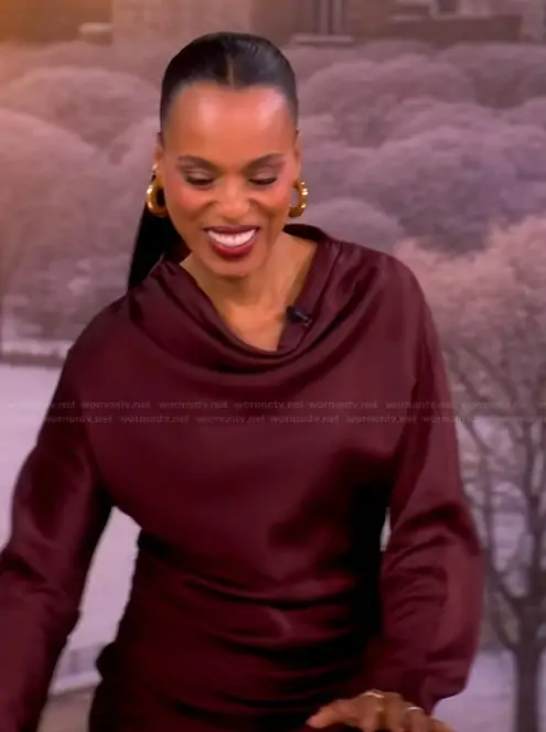 on The View on ABC was spotted wearing this burgundy drape top on The View on Mar 19 2026's episode. 's Top is the Victoria Long Sleeve Draped Top by Simkhai.