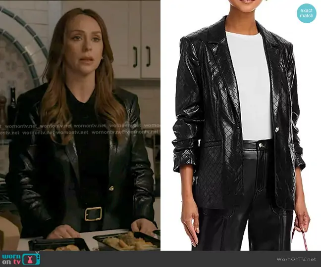 Maddie Kendall (played by Jennifer Love Hewitt) on 9-1-1 on ABC was spotted wearing this black hooded leather blazer on 9-1-1 on episode 'D.I.Y.' (9x14) in Mar 2026. Maddie's Jacket is the Hooded Vegan Leather Combo Blazer by Cinq a Sept.
