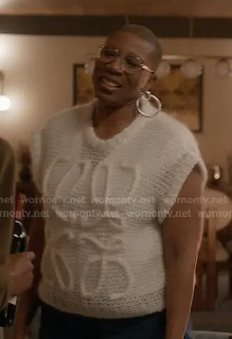 Henrietta Wilson (played by Aisha Hinds) on 9-1-1 on ABC was spotted wearing this white mohair knit vest on 9-1-1 on episode 'D.I.Y.' (9x14) in Mar 2026. Hen's Sweater is the Open-Knit Wool Vest with Anagram Detail by Loewe . Hen's Earrings is the Brilliance Hoops by Simone I. Smith.