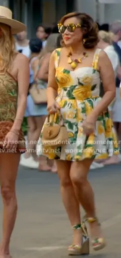 Jennifer Tilly on The Real Housewives of Beverly Hills on Bravo was spotted wearing this yellow rose print mini dress on The Real Housewives of Beverly Hills on episode 'Unmasking the Truth' (15x14) in Mar 2026. Jennifer's Dress is the Rose Print Corset Bodice Minidress by Dolce & Gabbana . Jennifer's Sunglasses is the Summer 2016 Collection by Dolce & Gabbana . Jennifer's Necklace is the Gold Brass Sicily Fruits Roses Statement Necklace by Dolce & Gabbana . Jennifer's Shose is the Floral Print Ankle Tie Wedge Sandal by Dolce & Gabbana.