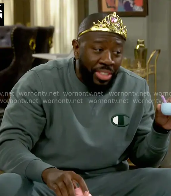 Malcom (played by Sheaun McKinney) on The Neighborhood on CBS was spotted wearing this green Champion sweatshirt and sweatpants on The Neighborhood on episode 'Welcome to the Two-Ring Circus' (8x13) in Mar 2026. Malcolm's Sweatshirt is the Embroidered Crewneck Sweatshirt by Champion.