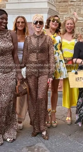 Erika Jayne on The Real Housewives of Beverly Hills on Bravo was spotted wearing this leopard sheer blouse and pants on The Real Housewives of Beverly Hills on episode 'Unmasking the Truth' (15x14) in Mar 2026. Erika's Top is the Fitted Button Up in Jaguar by Sprwmn . Erika's Pants is the Wide Leg Pintuck Trousers in Jaguar by Sprwmn . Erika's Sunglasses is the Drop Aviator Sunglasses by Bottega Veneta . Erika's Bag is the System Triangle Quilted Napa Mini Shoulder Bag by Prada.