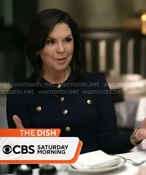 Meg Oliver on CBS Mornings on CBS was spotted wearing this Meg Olivers’ black cardigan with gold buttons on CBS Mornings on Mar 22 2026's episode. Meg's Sweater is the Toulouse Crop Cardigan in Black by L'Agence .