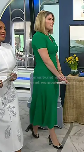 Jenna Bush Hager on Today on NBC was spotted wearing this black bow heel pumps on Today on Apr 13 2026's episode. Jenna's Shoes is the Fiammetta Patent Leather Pumps by Salvatore Ferragamo.