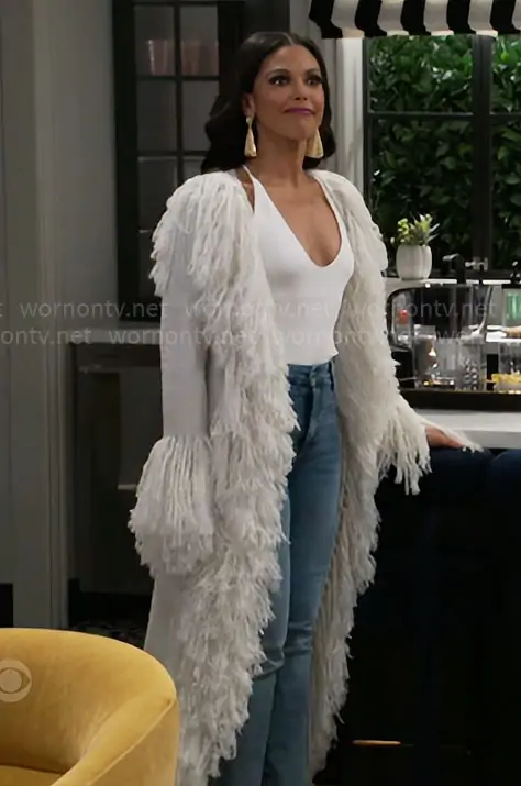 Dani Dupree (played by Karla Mosley) on Beyond the Gates on CBS was spotted wearing this white fringed long cardigan on Beyond the Gates on Mar 23 2026's episode. Dani's Sweater is the Burr It's Cold Outside Fringe Oversized Sweater in Ivory by Akira . Dani's Earrings is the Dres Earrings by Khoi.
