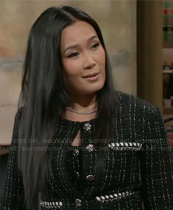Caroline Lee (played by Ellie Wang) on Beyond the Gates on CBS was spotted wearing this black tweed button front dress and jacket set on Beyond the Gates on Mar 23 2026's episode. Caroline's Dress is the Metallic Tweed Sheath Minidress by English Factory . Caroline's Jacket is the Windowpane Tweed Jacket by English Factory.