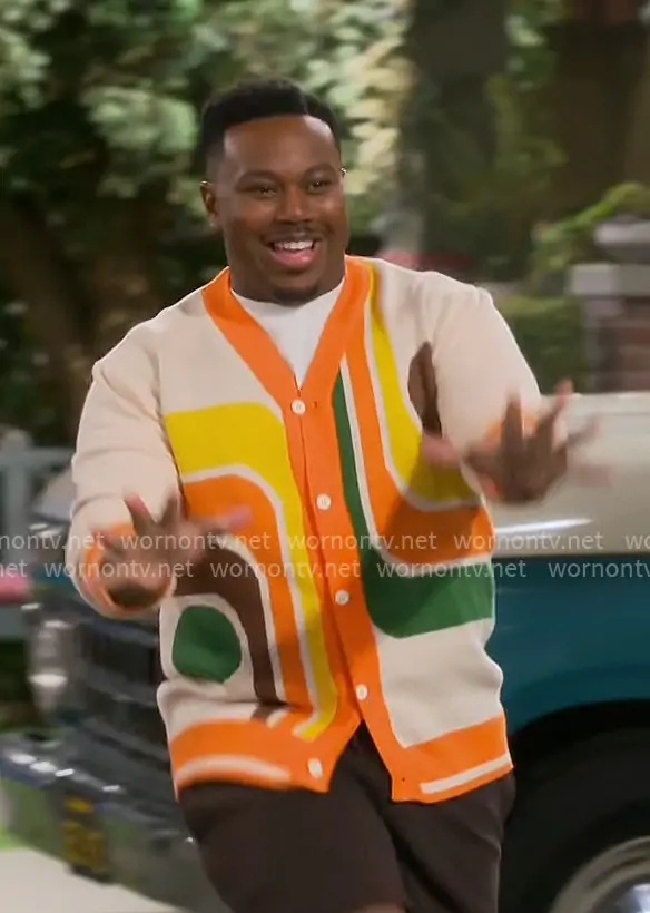 Marty (played by Marcel Spears) on The Neighborhood on CBS was spotted wearing this orange retro print cardigan on The Neighborhood on episode 'Welcome to the Two-Ring Circus' (8x13) in Mar 2026. Marty's Sweater is the Retro Knitted Cardigan by OXKnit.