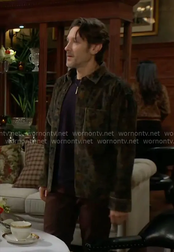 Daniel Romalotti (played by Michael Graziadei) on The Young and the Restless on CBS was spotted wearing this printed corduroy shirt on The Young and the Restless on Mar 23 2026's episode. Daniel's Shirt is the Relaxed-Fit Floral Corduroy Overshirt in Green Floral by Banana Republic.