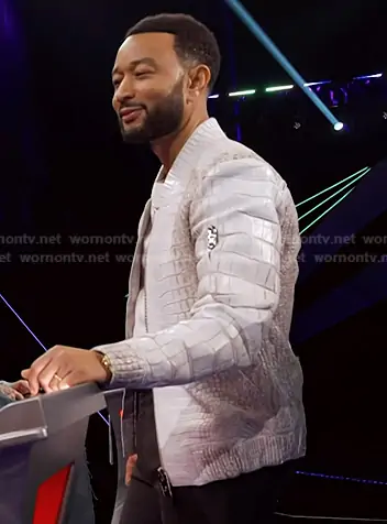 John Legend on The Voice on NBC was spotted wearing this John Legend’s white crocodile leather jacket on The Voice on Mar 24 2026's episode. John's Jacket is the Himalaya Crocodile Bomber Jacket MJZ 07 Collection by Maison MJZ.