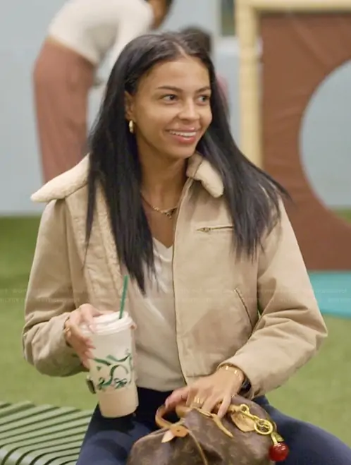 Layla Taylor on The Secret Lives of Mormon Wives on Hulu was spotted wearing this beige shearling collar jacket on The Secret Lives of Mormon Wives on episode 'The Book of Unearthing' (4x08) in Mar 2026. Layla's Jacket is the Barkley Workwear Jacket by TNA at Aritzia . Layla's Necklace is the Eternal Gold pendant necklace in yellow gold with diamonds by Prada.