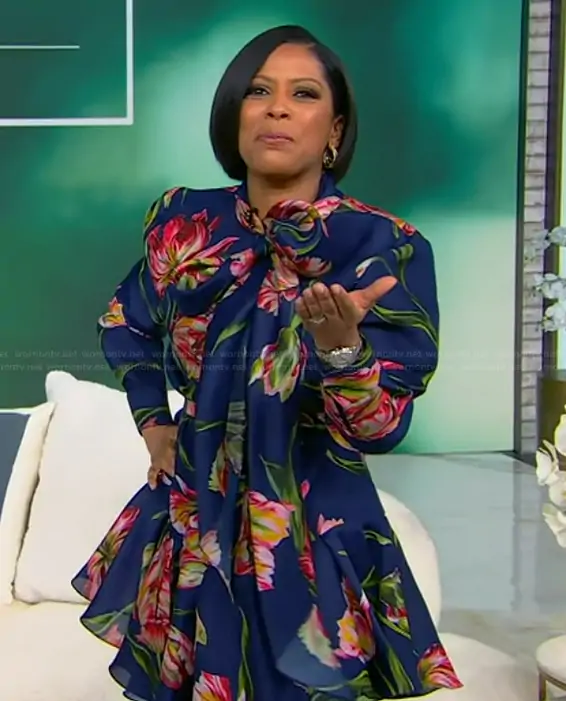 Tamron Hall on Tamron Hall Show on ABC was spotted wearing this blue floral print tie neck mini dress on Tamron Hall Show on Mar 24 2026's episode. Tamron's Dress is the Tulip Tie-Neck Mini Shirtdress by Carolina Herrera.