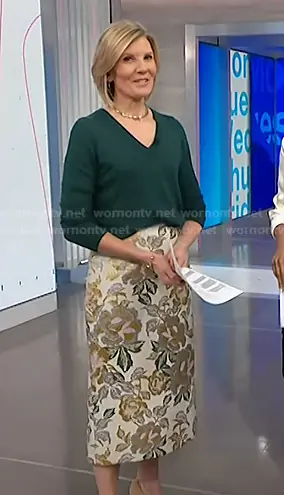 Kate Snow on NBC News Daily on NBC was spotted wearing this green sweater and beige floral pencil skirt on NBC News Daily on Mar 24 2026's episode. Kate's Skirt is the Brocade Midi Skirt by Carolina Herrera.