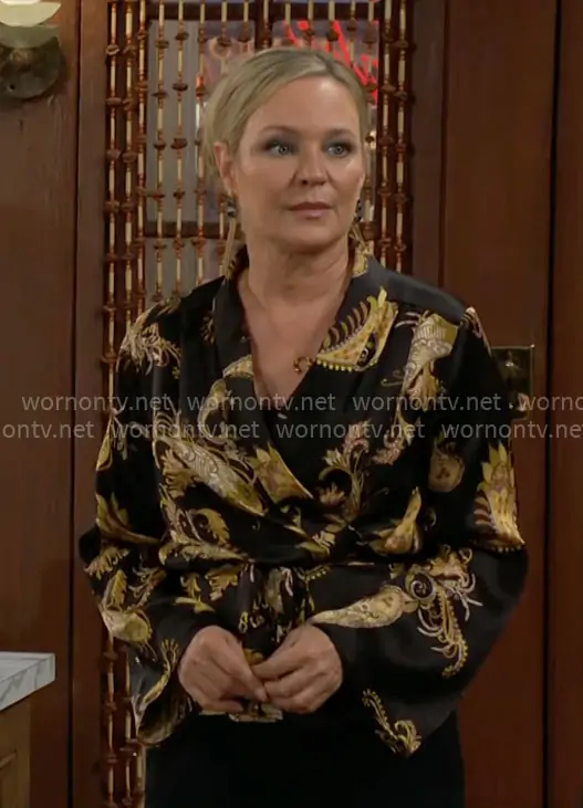 Sharon Newman (played by Sharon Case) on The Young and the Restless on CBS was spotted wearing this black and yellow paisley print wrap blouse on The Young and the Restless on Mar 25 2026's episode. Sharon's Top is the Olive Wrap Blouse by L'Agence.