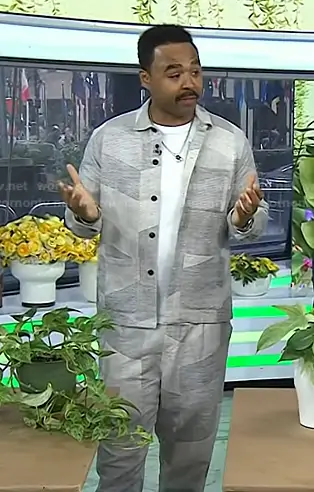 on Today on NBC was spotted wearing this grey colorblock jacket and pants on Today on Mar 26 2026's episode. 's Jacket is the Shop Jacket in Ash Zigzag by 3sixteen . 's Pants is the Drawstring Pants in Ash Zigzag by 3sixteen.