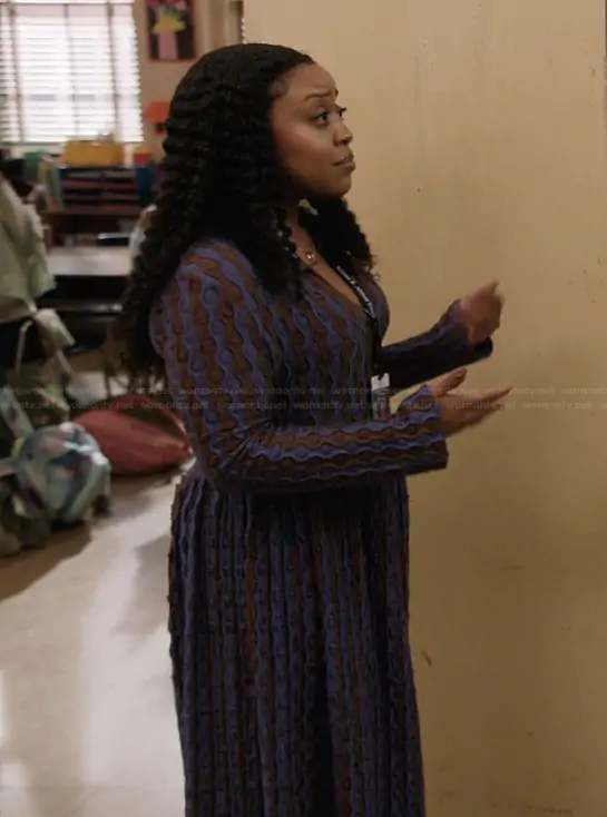 Janine Teagues (played by Quinta Brunson) on Abbott Elementary on ABC was spotted wearing this blue textured dress on Abbott Elementary on episode 'No Homework' (5x17) in Mar 2026. Janine's Dress is the Textured Stripe Dress by Carlota Cahis.