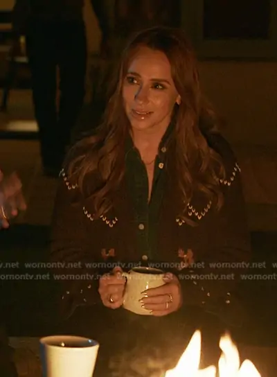 Maddie Kendall (played by Jennifer Love Hewitt) on 9-1-1 on ABC was spotted wearing this Maddie’s navy horse print cardigan on 9-1-1 on episode 'Pick Your Poison' (9x15) in Mar 2026. Maddie's Sweater is the The Horse Lodge Cotton Blend Cardigan by The Great.