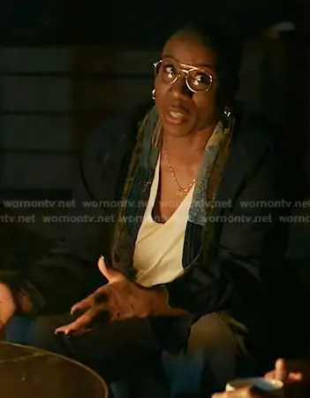 Henrietta Wilson (played by Aisha Hinds) on 9-1-1 on ABC was spotted wearing this navy patchwork trim denim jacket on 9-1-1 on episode 'Pick Your Poison' (9x15) in Mar 2026. Hen's Jacket is the Tiger Juddbhan Corduroy-Trimmed Denim Shirt in Blue by Kapital.