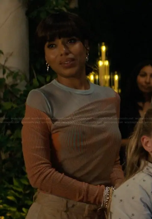 Eleanor (played by Kerry Washington) on Imperfect Women on Apple was spotted wearing this printed drape bodysuit on Imperfect Women on episode 'Crush' (1x02) in Mar 2026. Eleanor's Bodysuit is the Double Layer Pinstripe Body Morphing Bodysuit Mint And Coral by Jean Paul Gaultier.