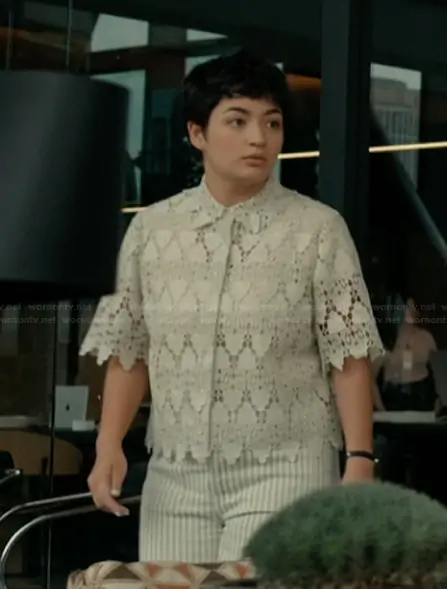 Olivia (played by Tess Aubert) on Imperfect Women on Apple was spotted wearing this white lace top on Imperfect Women on episode 'Monster' (1x03) in Mar 2026. 's Top is the Lace Button-Up Shirt by Frame.