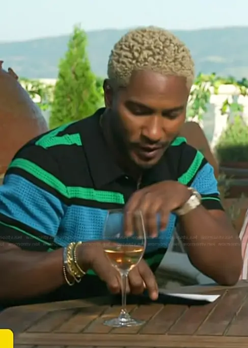 Scott Evans on Access Hollywood on NBC was spotted wearing this black striped polo on Access Hollywood on Mar 27 2026's episode. Scott's Shirt is the Stripe Cotton Polo by Venroy.