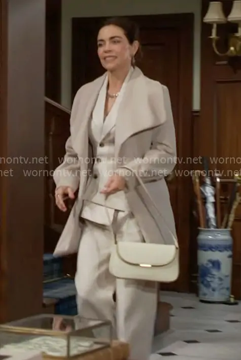 Victoria Newman (played by Amelia Heinle) on The Young and the Restless on CBS was spotted wearing this off-white asymmetric suit on The Young and the Restless on Mar 29 2026's episode. Victoria's Jacket is the Thalia Blazer in Light Beige by Maniere de Voir . Victoria's Pants is the Julie Pants in Light Beige by Maniere de Voir . Victoria's Coat is the Ella Coat in Soft Almond by Tahari . Victoria's Bag is the Zamora Bag in Ivory by Sancia.