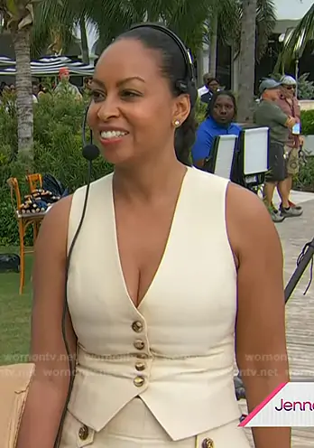on Today on NBC was spotted wearing this beige vest and shorts on Today on Mar 29 2026's episode. 's Vest is the Luna Wool Silk Waistcoat by Zimmermann . 's Shorts is the Luna Wool Silk Tailored Short by Zimmermann . 's Shoes is the Helix 75 Braided Leather Sandals by Zimmermann.