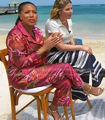 Sheinelle Jones on Today on NBC was spotted wearing this gold strappy heel sandals on Today on Mar 29 2026's episode. Sheinelle's Shoes is the Nara Mid Sandal in Platinum by Schutz.