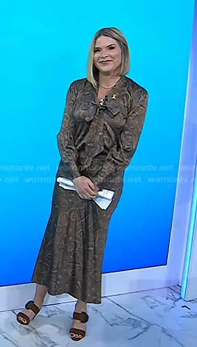 Jenna Bush Hager on Today on NBC was spotted wearing this brown print tie neck blouse and skirt on Today on Mar 30 2026's episode. Jenna's Top is the Francine Print Tie Neck Silk Blend Top by Veronica Beard . Jenna's Skirt is the Clover Bias Cut Silk Blend Skirt by Veronica Beard.