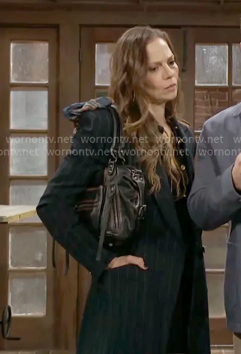 Sienna Bacall (played by Tamara Braun) on The Young and the Restless on CBS was spotted wearing this pinstripe coat, gold striped shirt and bag on The Young and the Restless on Mar 30 2026's episode. Sienna's Top is the Cosette Velvet Shirt by L'Agence . Sienna's Coat is the Melia Mac Coat by Free People . Sienna's Bag is the Emerson Tote by Free People.