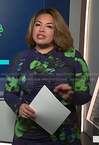 Gilma Avalos on NBC News Daily on NBC was spotted wearing this navy and green print ruched dress on NBC News Daily on Mar 30 2026's episode. Gilma's Dress is the Milani Floral Ruched Midi-Dress by Amur.