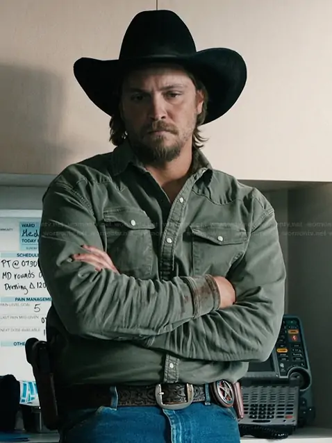 Kayce Dutton (played by Luke Grimes) on Marshals on Paramount was spotted wearing this green button down western shirt on Marshals on episode 'Piya Wiconi' (1x01) in Mar 2026. Kayce's Shirt is the Ranger Colored Denim Snap Shirt In Army by Axel's.