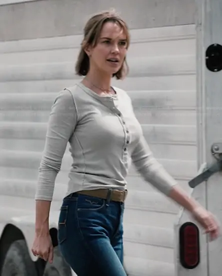 Belle Skinner (played by Arielle Kebbel) on Marshals on Paramount was spotted wearing this gray henley on Marshals on episode 'Zone of Death' (1x02) in Mar 2026. Belle's Top is the We The Free Jamie Henley In Quiet Grey by Free People . Belle's Pants is the Jennifer Dark Wash Denim Jeans by Kimes Ranch.