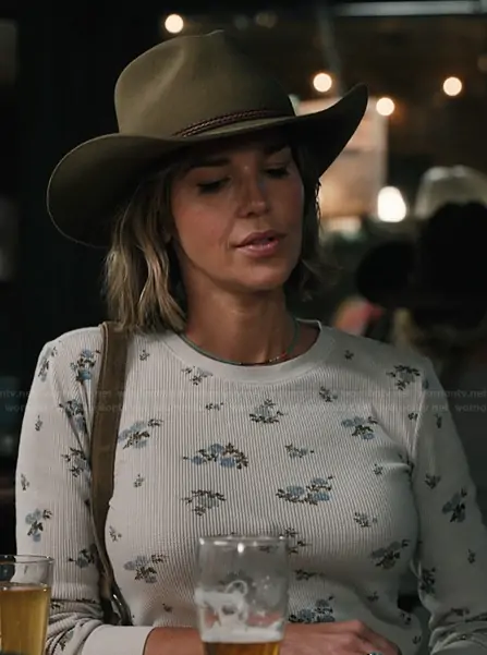 Belle Skinner (played by Arielle Kebbel) on Marshals on Paramount was spotted wearing this white floral print top on Marshals on episode 'Zone of Death' (1x02) in Mar 2026. Belle's Top is the Darling Long Sleeve Slim Tee by Out From Under.