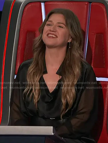 Kelly Clarkson on The Voice on NBC was spotted wearing this black sheer sleeve dress on The Voice on Mar 31 2026's episode. Kelly C's Dress is the Scarf Shirt Dress by Helmut Lang.