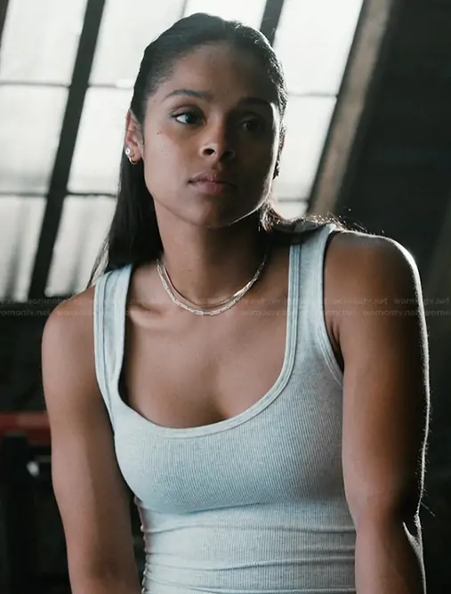 Andrea Cruz (played by Ash Santos) on Marshals on Paramount was spotted wearing this gray tank on Marshals on episode 'The Gathering Storm' (1x04) in Mar 2026. Andrea's Top is the Bra-Free Rib Scoopneck Tank by Abercrombie and Fitch.
