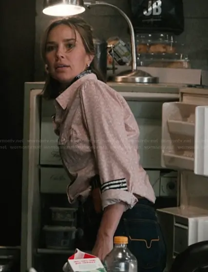 Belle Skinner (played by Arielle Kebbel) on Marshals on Paramount was spotted wearing this Belle floral western shirt on Marshals on episode 'The Gathering Storm' (1x04) in Mar 2026. Belle's Top is the All Occasion Blush Pink Western Snap Shirt by Wrangler . Belle's Pants is the Jennifer Dark Wash Denim Jeans by Kimes Ranch.